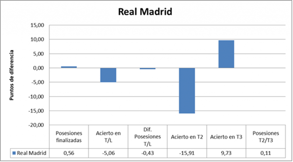 El Real Madrid finalizó 0,5 posesiones más. Pese a una eficiencia en ataque razonable, con sus 1,1125 puntos por posesión finalizada, fracasó en defensa, permitiendo al rival 1,2579 puntos por posesión finalizada.