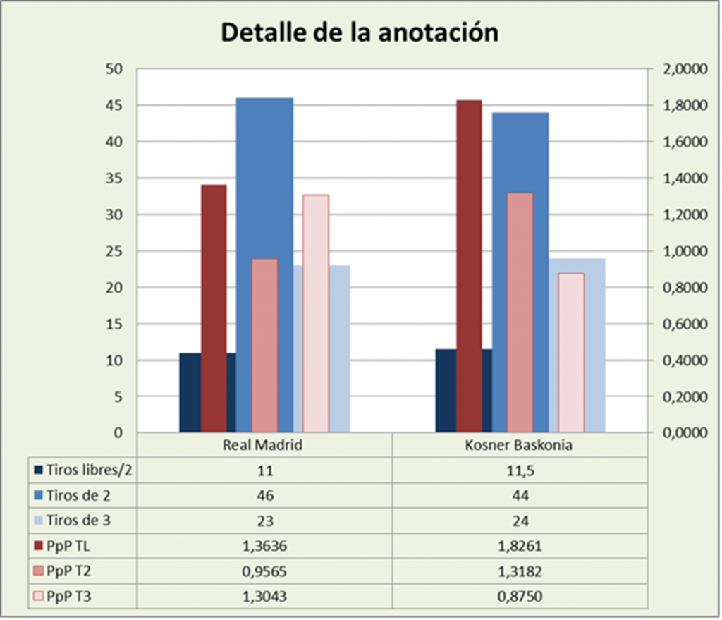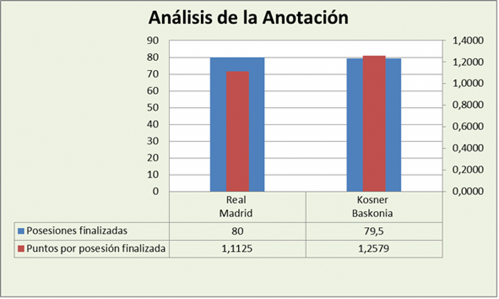 El Real Madrid dispuso de 11 posesiones desdde el 4,60 (el 13,75% de las finalizadas). Anotó 15 lanzamientos, con un pobre 68,18% de acierto, que equivale a 1,3636 puntos por lanzamiento. Baskonia contó con 11,5 posesiones (el 14,47% de las finalizadas). Anotó 21 lanzamientos, con un excelente 91,30% de acierto, que equivale a 1,8261 puntos por posesión. El partido habría sido muy distinto si el Real Madrid hubiese llegado a los últimos 2:30 minutos con un porcentaje más razonable de tiros libres y 2 ó 3 puntos de ventaja.