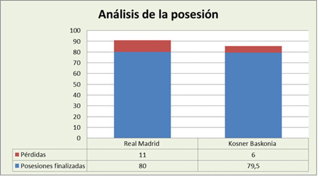 Ritmo de juego muy alto, a 91/85,5 posesiones. La diferencia se debe principalmente a que el Real Madrid consiguió 9 rebotes más en ataque. El equipo blanco perdió 11 balones (el 12,09% de las posesiones totales) y Baskonia 6 (el 7,02% de las posesiones totales). Ninguno tuvo pérdidas altas, pero cabe achacar a los de Madrid que no provocaron apenas pérdidas al rival.