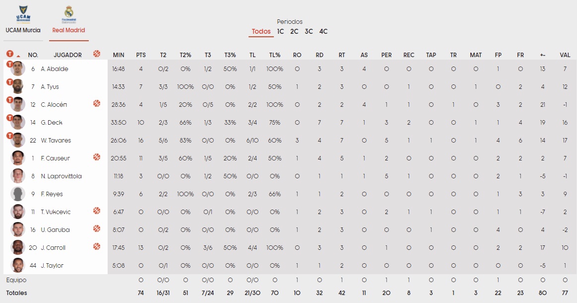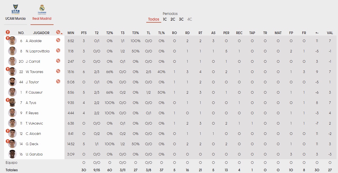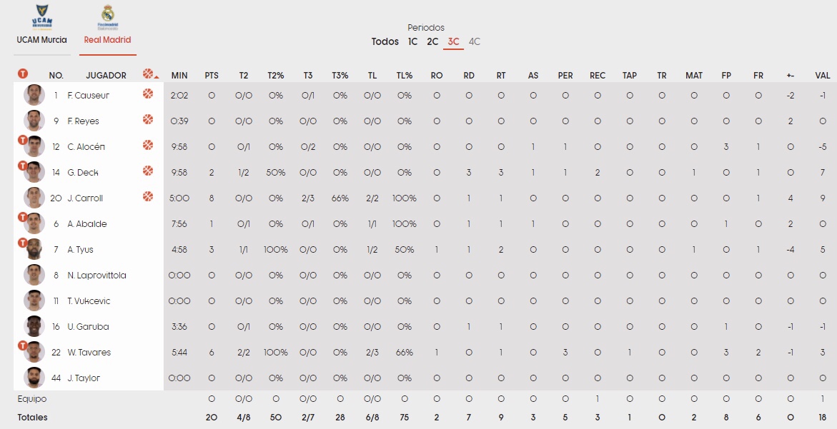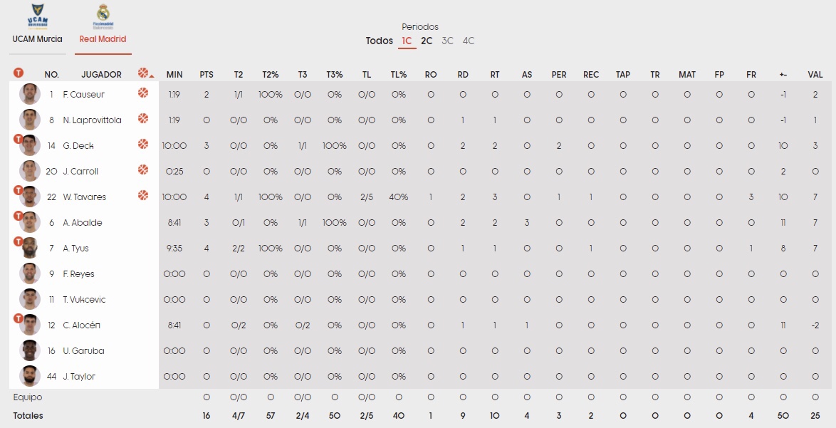 El partido se juega al ritmo que marca el equipo de Pablo Laso para un 3/12 a falta de 5 minutos. Alex Tyus suma en ataque y en defensa lo que es muy buena noticia para los blancos, los últimos 5 minutos llega el desacierto en ataque y frena el aumento de la diferencia en el luminoso, pero gracias a la buena defensa del equipo los murcianos no encuentran la manera de ver aro.
