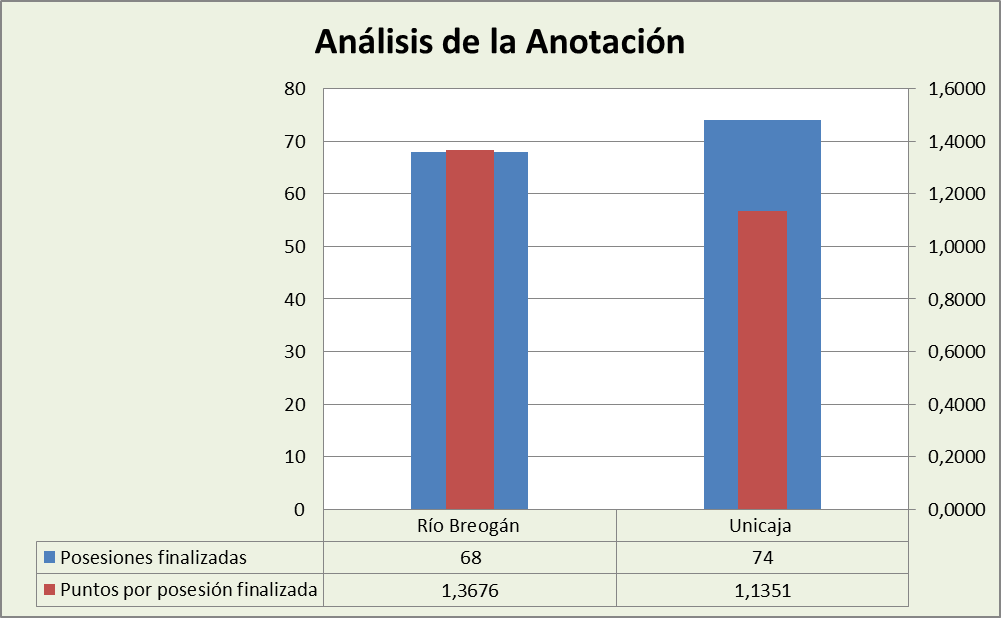 En el partido que estamos añalizando vemos que Unicaja finalizó más posesiones, pero Río Breogán consiguió 1,3676 puntos por posesión finalizada. Es una efectividad muy alta.