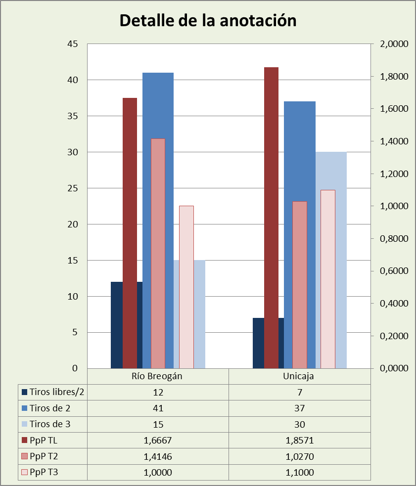 La victoria de Breogán / derrota de Unicaja estuvo en la mala defensa del tiro de 2 por parte de Unicaja. Breogán, además, provocó más faltas personales de tiro. Unicaja consiguió más posesiones, gracias a su excelente trabajo en el rebote (tanto ofensivo como defensivo, aunque los números absolutos parecen decir otra cosa).