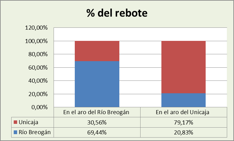 Eso es un contrasentido: si un equipo ha estado bien en el rebote defensivo, el contrario no ha podido coger muchos rebotes ofensivos. Lo que ocurre en este partido es paradigmático de ese error. Breogán apenas falló tiros en el aro de Unicaja y, por tanto, nadie pudo capturar ni muchos rebotes ofensivos ni muchos rebotes defensivos en ese aro. El análisis debe hacerse en términos porcentuales.