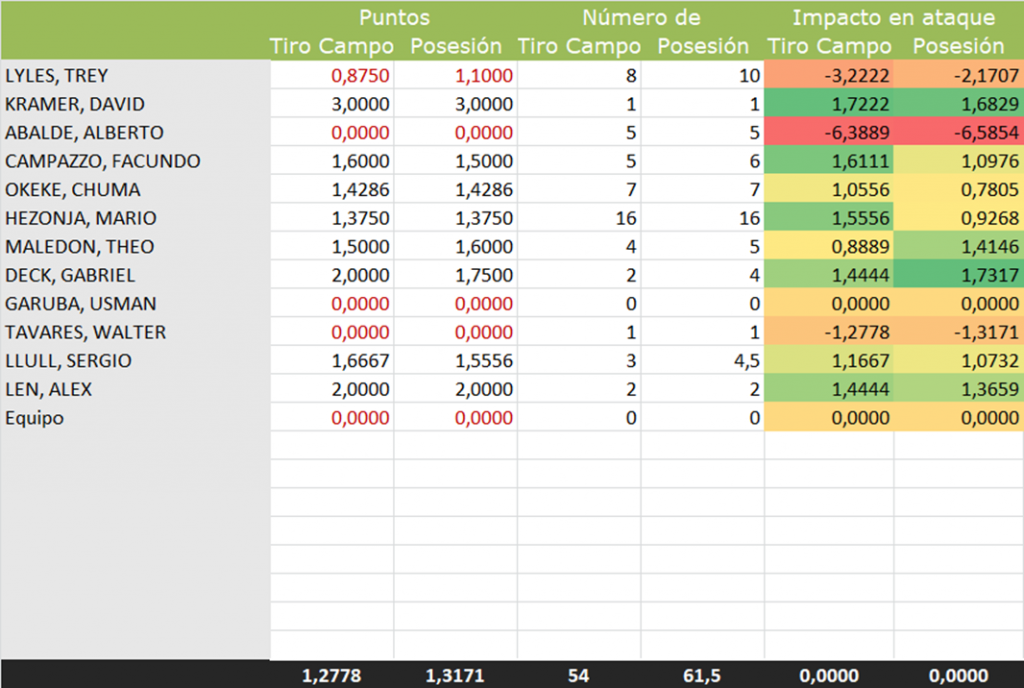 Anadolu Efes finalizó 9 posesiones más. Sin embargo el conjunto blanco lo superó en eficiencia, pues los turcos se quedaron en unos correctos 1,0638 puntos por posesión finalizada, mientras que el Real Madrid logró unos excelentes 1,3171.