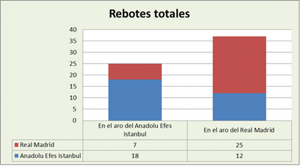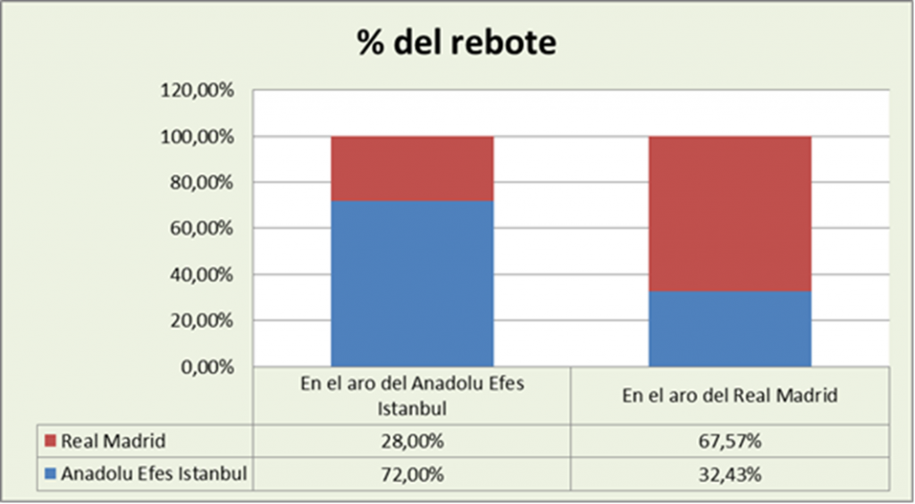 Anadolu Efes protegió bien su aro, ya que retuvo el 72% de los rechaces que se produjeron en su zona. El Real Madrid, que llevaba varios partidos dominando esta faceta, no se supo imponer y se limitó a capturar el 67,57%. Esto deja al equipo azul oscuro el 32,43% de los rebotes en aro contrario, mientras que los de blanco sólo pudieron hacerse con el 28%. anadolu Efes ganó el rebote, el Real Madrid debe volver a la senda de partidos anteriores.