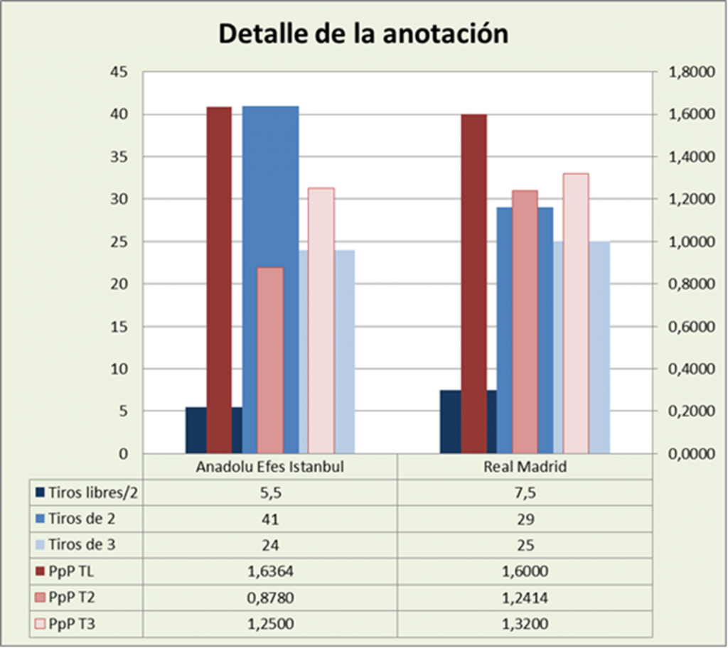Lo más destacable es la enorme eficiencia en el tiro del Real Madrid, que supo aunar con una defensa interior excelente, en la que concedió muy pocos tiros libres. Además, llevó al equipo turco a jugar más donde menos eficiente resultaba. Así, el Real Madrid estuvo excelente en: