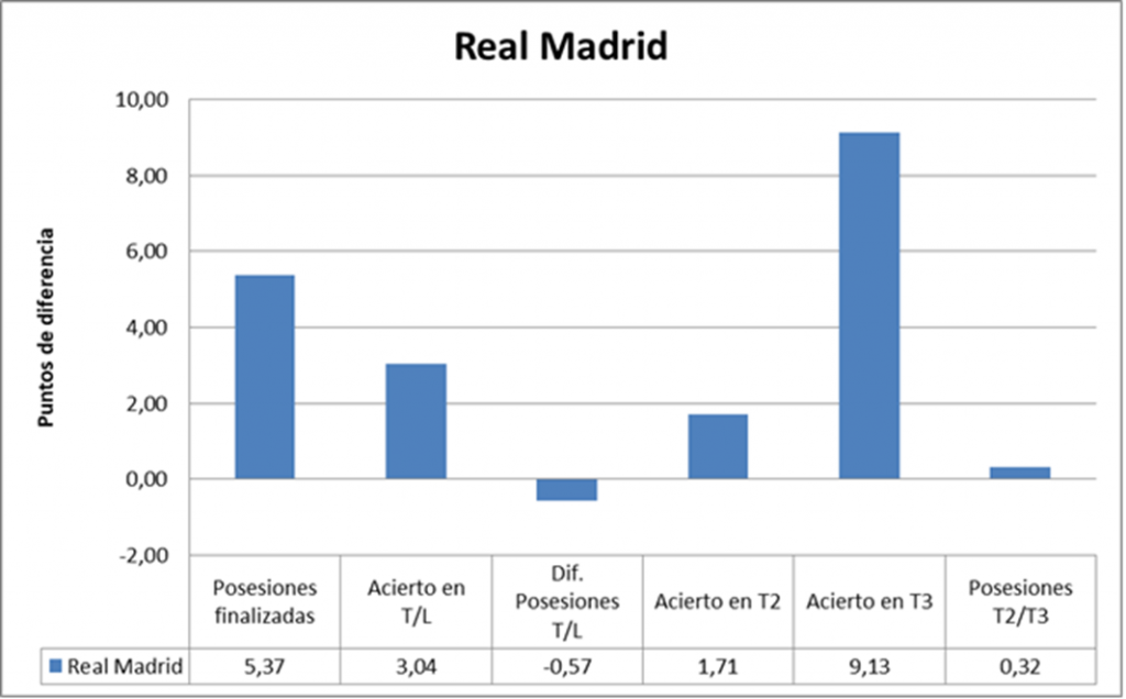 El Real Madrid finalizó 4,5 posesiones más. También estuvo más eficiente, ya que anotó 1,1940 puntos por posesión, por los 0,9760 de su rival. El conjunto blanco defendió bien y atacó bien.