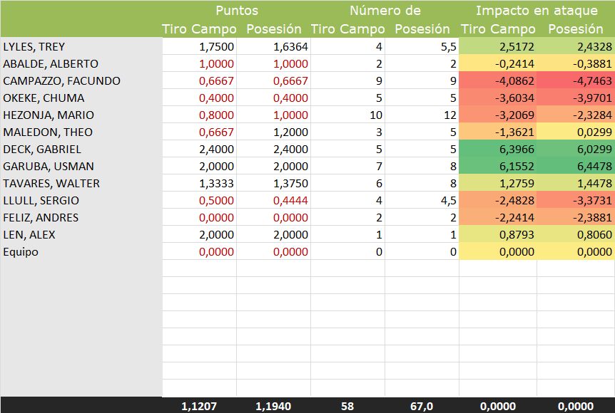 Análisis de la aportación de los jugadores del Real Madrid en ataque, comparada con el promedio del equipo