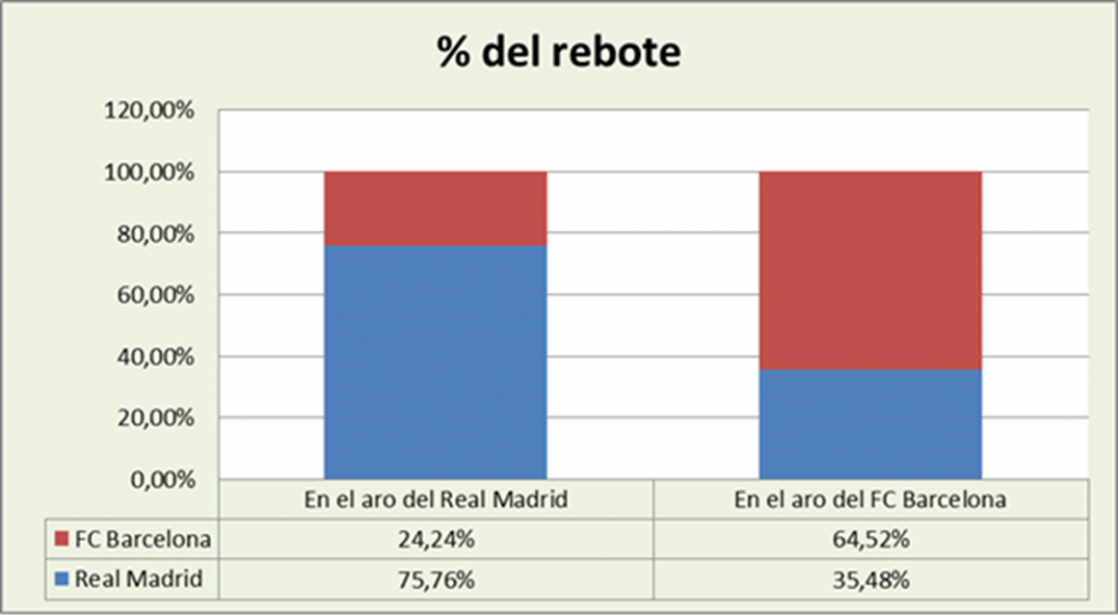 El Real Madrid retuvo el 75,76% de los rechaces en su propio aro, mientras que el conjunto catalán capturó sólo el 64,52% de los que se produjeron en el suyo. Eso deja un muy buen 35,48% para el rebote ofensivo madrileño por un pobre 24,24% para el blaugrana.