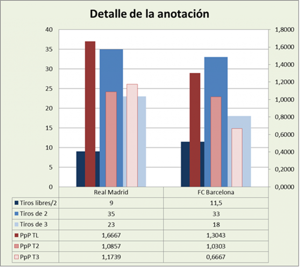 El equipo de Madrid concentró su juego por dentro, con el 60,34% de sus tiros de campo. Anotó unos buenos 1,0857 puntos por lanzamiento (54,29% de eficacia). El FC Barcelona también concentró su juego por dentro del 6,75, en concreto el 64,71% de sus tiros de campo. Logró unos aceptables 1,0303 puntos por lanzamiento (51,52% de eficiencia).