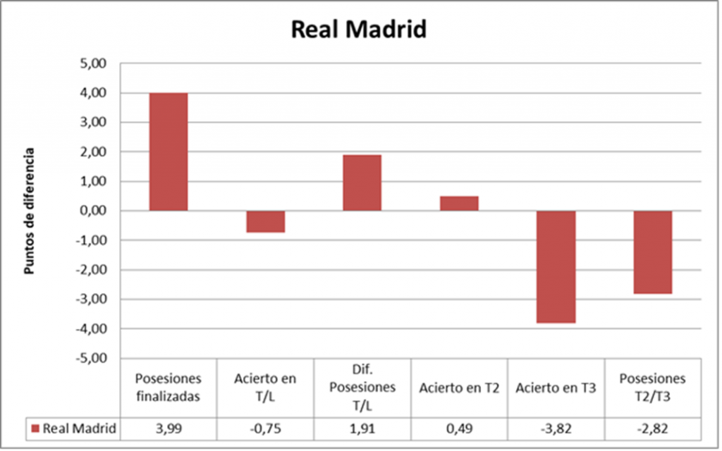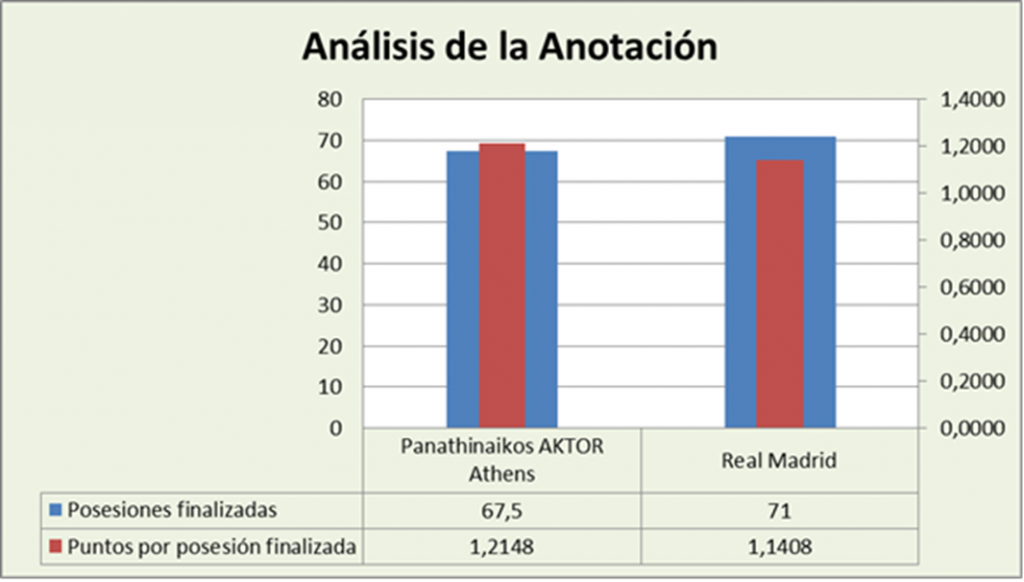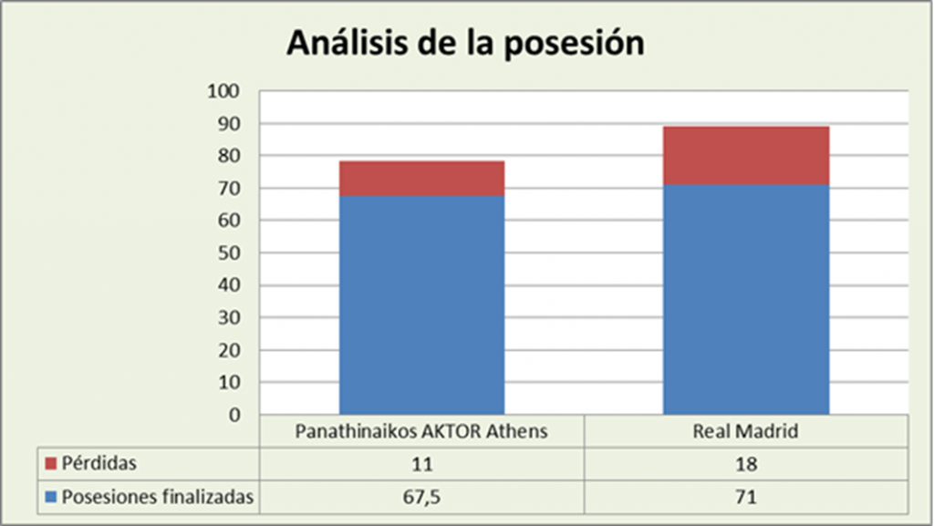 El Real Madrid finalizó 3,5 posesiones más, pero estuvo menos eficiente. El equipo ateniense anotó unos excelentes 1,2148 puntos por posesión finalizada, mientras que el conjunto blanco se quedó en unos buenos 1,1408. Los ataques superaron a las defensas.