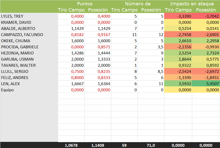 Análisis de la aportación de los jugadores del Real Madrid en ataque, comparada con el promedio del equipo