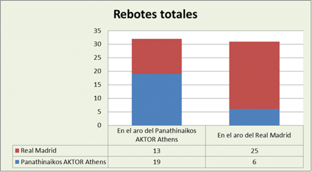El Panathinaikos naufragó en el cierre de su propio rebote, pues sólo fue capaz de atrapar el 59,38% de los rechaces en aro propio, mientras que los blancos retuvieron el 80,65%. Eso deja para los griegos el 19,35% de los rechaces en aro contrario, mientras que el conjunto madrileño capturó el excelente 40,63%. Conclusión, el Real Madrid dominó de forma total el rebote en aro propio y estuvo excelente en aro contrario.