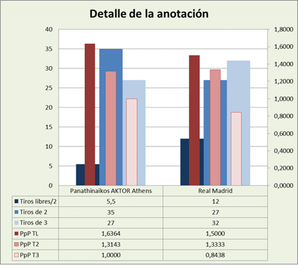 El número de rebotes ha sido de 32 en el aro ateniense, por 31 en el madrileño. La diferencia se explica porque los primeros tuvieron un acierto en el tiro de campo del 51,61%, mientras que el de los segundos fue del 45,76%. Además los madrileños finalizaron 3,5 posesiones más. Está claro que el Real Madrid ganó el rebote. Veamos ahora el estudio porcentual.