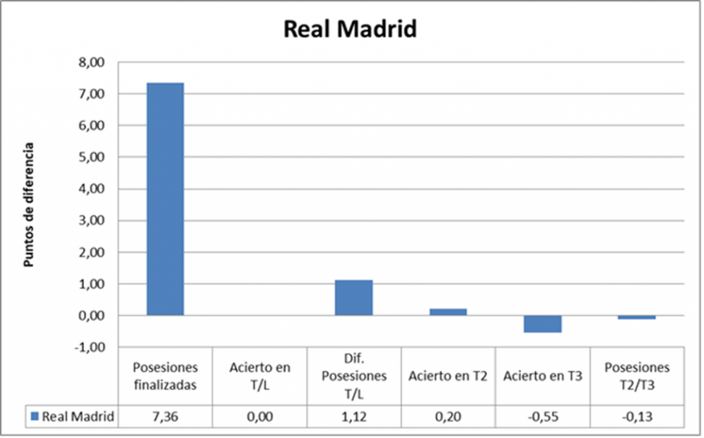 El Real Madrid finalizó 6 posesiones más. Las eficiencias estuvieron muy igualadas: los blancos anotaron 1,2267 puntos por posesión finalizada, mientras que los de negro se quedaron muy cerca, con sus 1,2174 puntos por posesión finalizada.