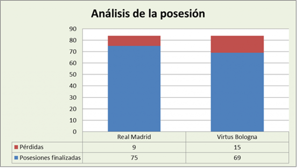 Ritmo alto, con 84/84 posesiones. Ambos dispusieron de la misma cantidad, porque no hubo diferencias en el rebote en ataque. El Real Madrid perdió 9 balones (el 10,71% de las posesiones totales), mientras que la Virtus perdió 15 (el 17,86% de las posesiones totales), perdidas muy altas por parte del conjunto italiano.