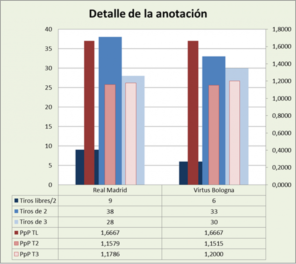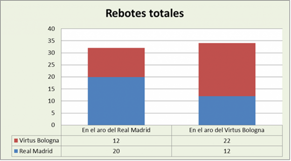 El número de rebotes ha sido de 32 en el aro madrileño por 34 en el del equipo boloñés. El conjunto de casa tuvo un acierto en el tiro de campo del 50,00%, mientras que el correspondiente a su rival fue del 49,21%%. Eso y las 6 posesiones finalizadas más por parte de los blancos, han equilibrado el número de rebotes en ambos aros. Pasemos ahora al estudio porcentual.