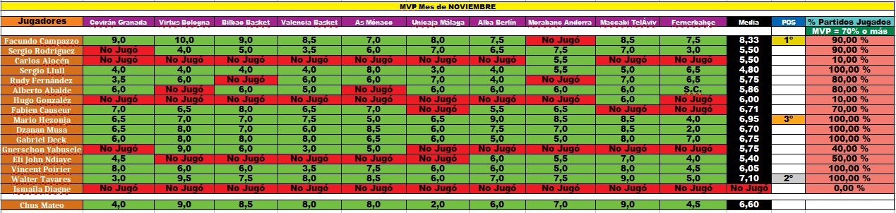 Diciembre se presenta muy cargado de partidos, donde Chus Mateo necesitará de varios jugadores al máximo nivel para poder ir complementando las victorias con unas rotaciones siempre necesarias para llegar en buen estado de forma para el momento de jugarse los títulos. Todos tendrán oportunidades de conseguir el próximo MVP pero, ¿quién lo ganará?