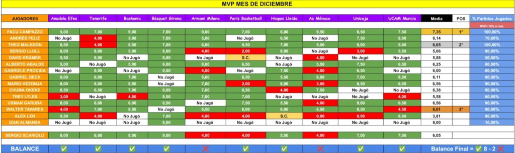 Normalmente, las votaciones suelen estar bastante igualadas, pero en esta ocasión el argentino ha sido claramente el más valorado, con una nota de 7,35. El segundo jugador con mayor nota ha sido Theo Maledon, con un 6,65, evidenciando la importancia que tienen los bases del equipo cuando rinden a buen nivel. En el tercer escalón del podio el siempre imprescindible Edy Tavares, con 6,61 de nota media.