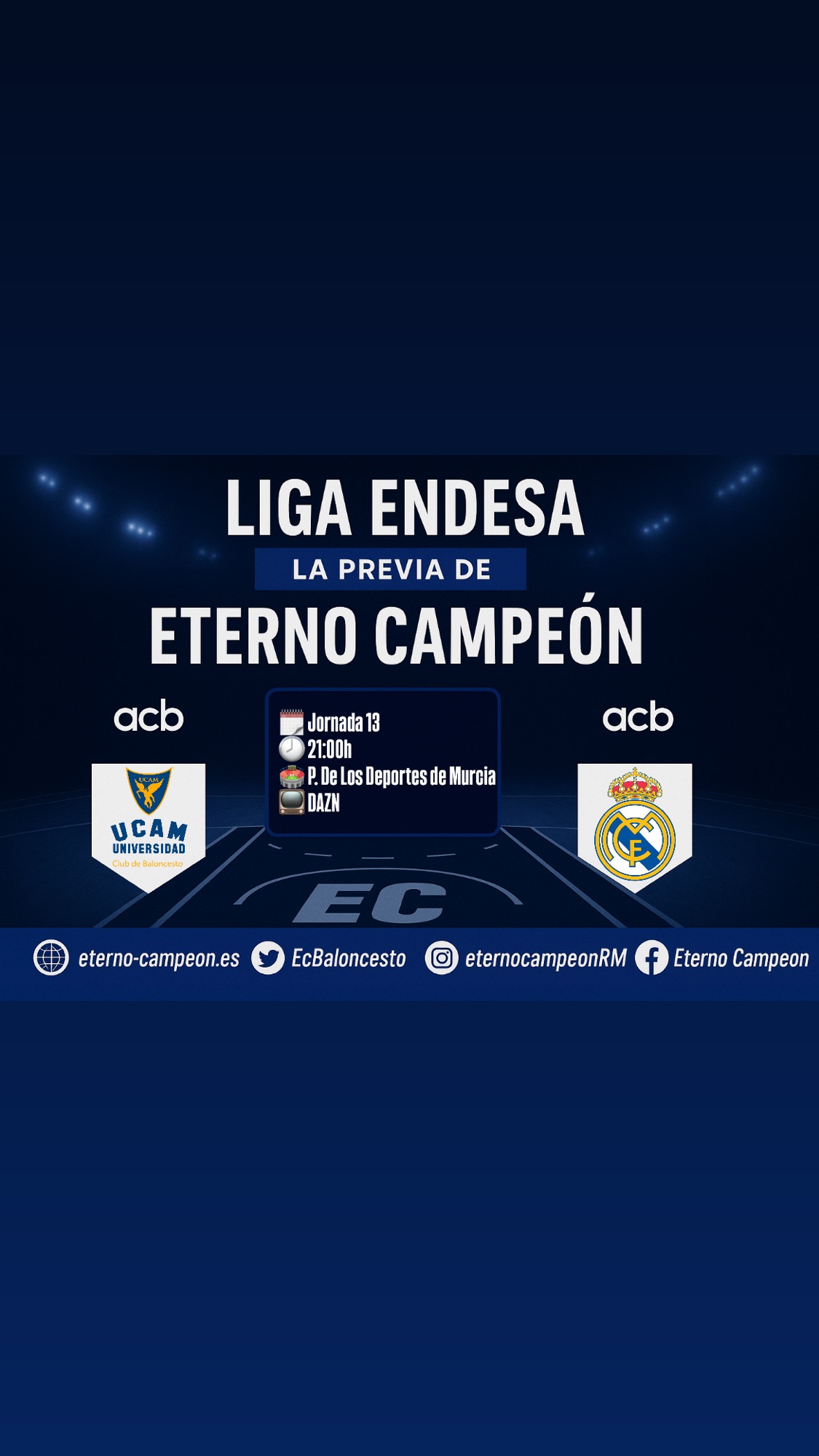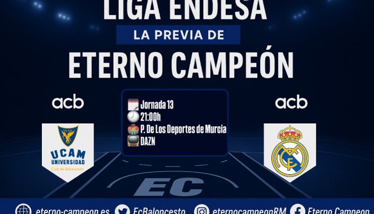 Decimotercera jornada de la liga regular de la ACB, donde el Real Madrid baloncesto visitará hoy martes 30 de diciembre a las 21 en el palacio de los deportes de Murcia al UCAM Murcia. El partido será televisado por Dazn pero disponible en la plataforma de movistar plus. Se espera un lleno absoluto para recibir al Real Madrid.
