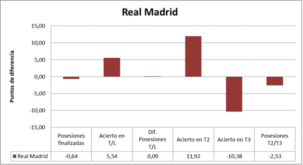 Los de verde dispusieron de 13 posesiones desde el 4,60 (el 18,06% de las finalizadas). Anotó 14 lanzamientos con un muy flojo 53,85% de acierto, que equivale a 1,0769 puntos por posesión. El Real Madrid contó con 12,5 posesiones (el 17,48% de las finalizadas). Transformó 19 tiros con un correcto 76,00% de acierto, que equivale a 1,5200 puntos por posesión.