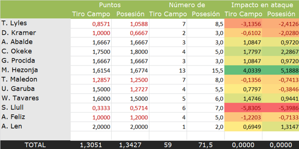 Análisis de la aportación de los jugadores del Real Madrid en ataque, comparada con el promedio del equipo