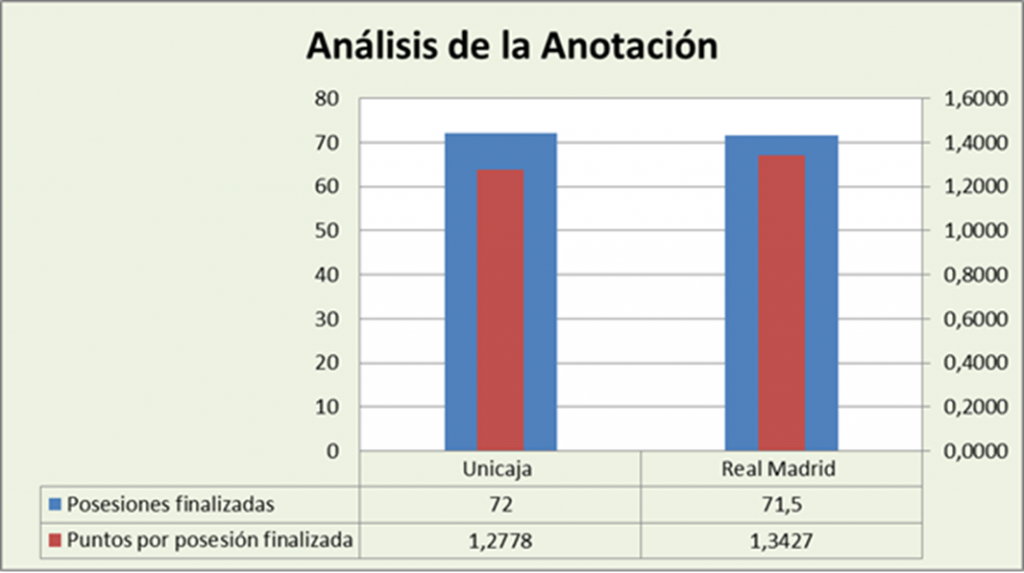 El conjunto malagueño finalizó 0,5 posesiones más, una diferencia no relevante. Las eficiencias alcanzadas han sido muy altas: los de verde han conseguido 1,2778 puntos por posesión finalizada. Los blancos han anotado unos magníficos 1,3427 puntos por posesión finalizada. Los ataques pudieron a las defensas.