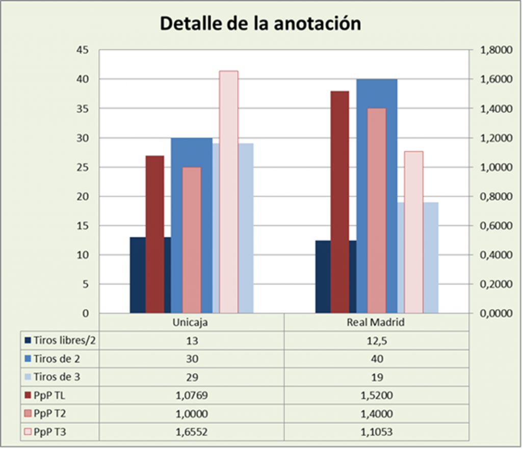 A Unicaja le han matado sus fallos en los tiros libres. Contando sólo los tiros de campo, Unicaja habría ganado por 1 punto. Por otra parte, no supo leer donde estaba haciendo más daño al Real Madrid y no concentró su ataque en el tiro de tres. El Real Madrid sí leyó correctamente cómo atacar y concentró su juego por dentro. Hay que recalcar la mala defensa de ambos equipos, que han encajado anotaciones muy altas.