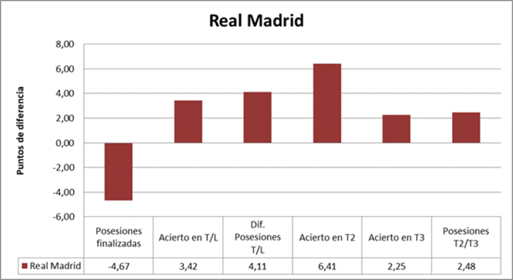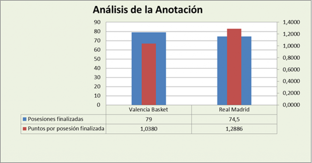 El equipo taronja finalizó 4,5 posesiones más, pero el blanco lo superó claramente en eficiencia. Los valencianos se quedaron en 1,0380 puntos por posesión finalizada y el Real Madrid llegó a 1,2886. Lograron 0,2506 puntos más más porposesión finalizada.