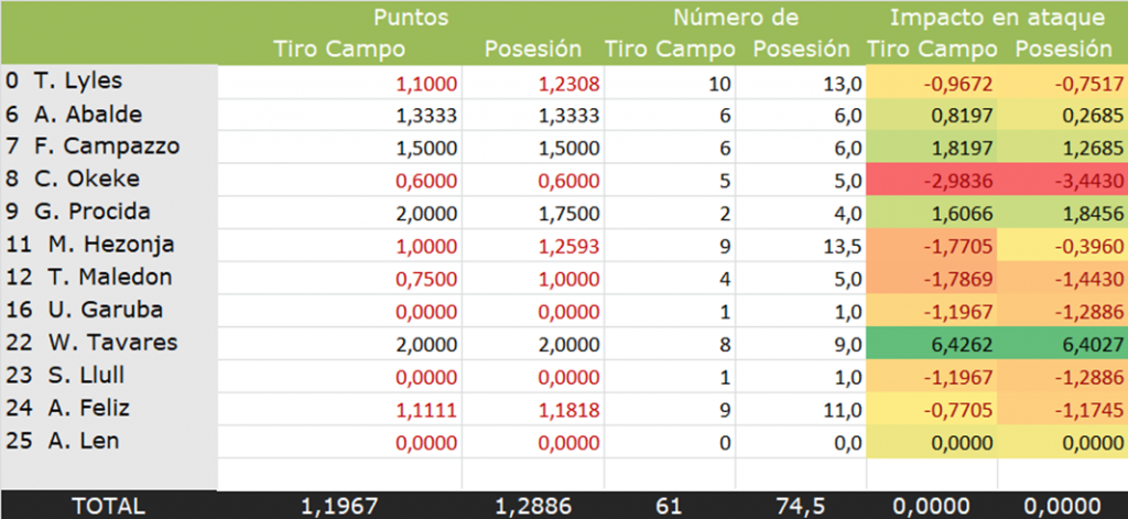 Casi 1,20 puntos por tiro de campo es una eficiencia excelente, lo mismo ocurre con los casi 1,29 puntos por posesión finalizada. Eso hace que, algunos jugadores que han lanzado bien, estén por debajo de la media del equipo.