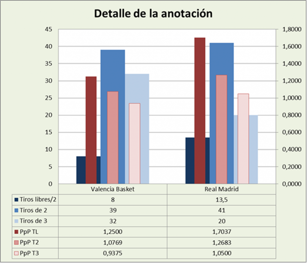 El conjunto taronja intentó de dos puntos el 54,93% de sus tiros de campo. Consiguió unos correctos 1,0769 puntos por lanzamiento (53,85% de eficacia). El Real Madrid acertó con la decisión de concentrar su juego por dentro, el 67,21% de sus tiros de campo. Transformó 1,2683 puntos por lanzamiento (unos excelentes 63,41% de eficiencia).