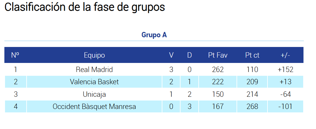 La fase de grupos fue un auténtico paseo para el Real Madrid. Cerró los marcadores en el tercer cuarto contra Manresa (95-42) y Unicaja (26-77). Ambos equipos tienen un claro déficit de centímetros y no pudieron competir con nuestros pivots. Pero sorprendió lo contundente de la victoria contra Valencia (42-93). Marcador cerrado en el último cuarto. Además de Moussa, Samba, Oumar y de Mason, nuestro invitado, hay que destacar a Gael Gómez un jugador que roza la excelencia técnica, muy inteligente, hábil y con buen tiro. Hay un vídeo en el canal de Youtube que habla de él.