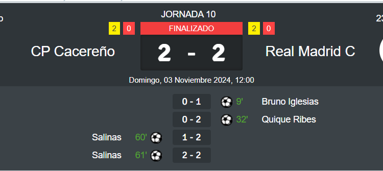 El Real Madrid C se ve empatado en un minuto y suma otro punto ante el Cacereño, continuando en zona de descenso (2-2). Goles madridistas de Bruno Iglesias y Quique Ribes.