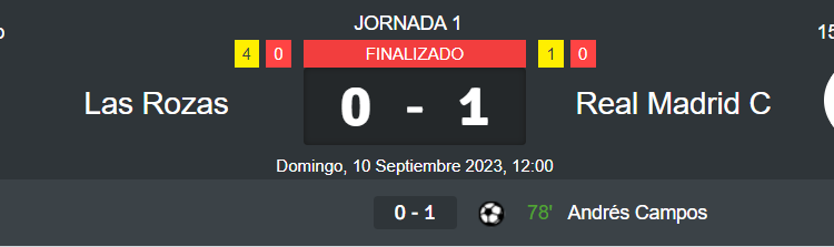 El Real Madrid C renació oficialmente en Las Rozas y con victoria, encuentro que se saldó por 0-1, gol madridista de Andrés Campos. Jornada 1 de la Tercera Federación 2023/24, Grupo 7.