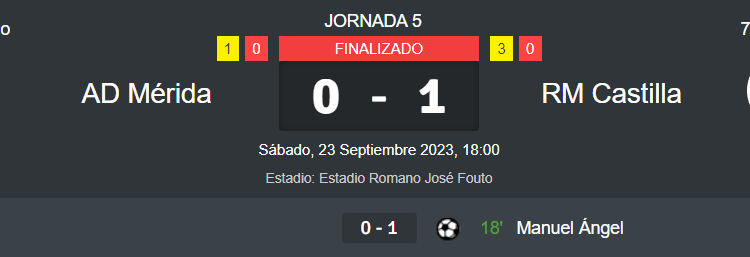 El Real Madrid Castilla volvió a la senda de la victoria tras dos partidos, con victoria por 0-1 en Mérida, gol madridista de Manuel Ángel Morán. Jornada 5 de la Primera Federación 2023/24.