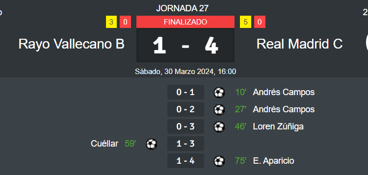 El Real Madrid C continúa su camino hacia el ascenso directo, suma su sexta victoria consecutiva y se mantiene líder con 10 puntos de ventaja a 7 jornadas para el final de la liga (1-4, doblete de Andrés Campos y goles de Borja Alonso y Esteban Aparicio). Jornada 27 de la Tercera Federación 2023/24, Grupo 7.