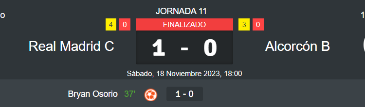 El Real Madrid C vuelve a la senda de la victoria tras cosechar una por la mínima ante el Alcorcón B, gol en propia puerta (1-0). Jornada 11 de la Tercera Federación 2023/24, Grupo 7.