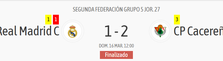El Real Madrid C vive un partido delirante, donde comenzó dominando ante el Cacereño, se vio con una expulsión injusta en el 34´, se adelantó en el marcador para verse igualado y luego remontado en el descuento (1-2), tras pararse el partido 25 minutos por la lesión de un linier.