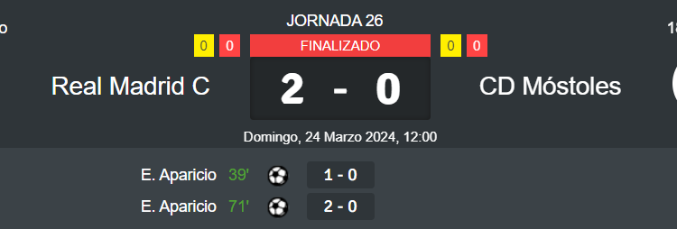 • 2 por parte del Real Madrid C. Amarillas a Miguel Ángel Romera y Borja Alonso.