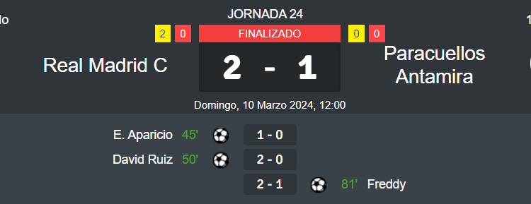 El Real Madrid C suma su tercera victoria consecutiva y mantiene su ventaja como líder a 10 jornadas para el final (2-1, goles madridistas de Esteban Aparicio y David Ruiz). Jornada 24 de la Tercera Federación 2023/24, Grupo 7.