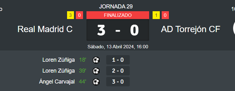 El Real Madrid C vuelve a ganar en casa ante el Torrejón y se mantiene líder con 10 puntos de ventaja a 5 jornadas para el final de la liga (3-0, doblete de Loren Zúñiga y gol de Ángel Carvajal). Jornada 29 de la Tercera Federación 2023/24, Grupo 7.