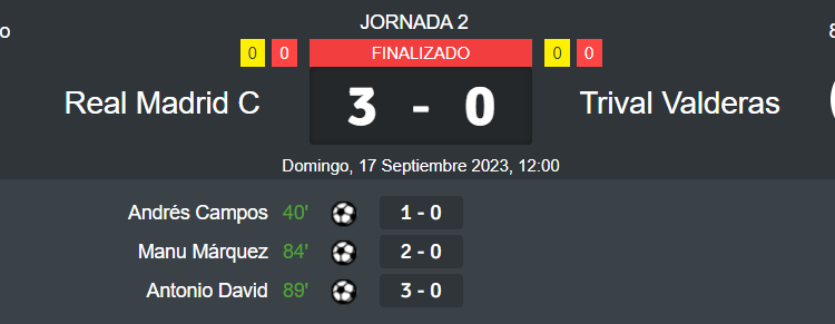 El Real Madrid C saldó su segundo encuentro con victoria por 3-0, goles madridistas de Andrés Campos, Manu Márquez y Antonio David Moreno. Jornada 2 de la Tercera Federación 2023/24, Grupo 7.