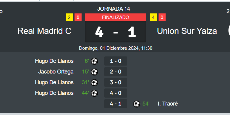 - Tercer gol de Jacobo Ortega (2006) y primera asistencia con el Real Madrid C. El delantero, en edad juvenil, es el segundo máximo artillero del equipo.
