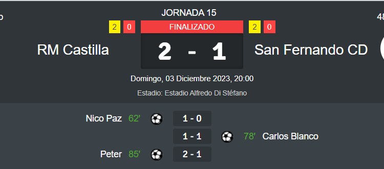 - Séptimo gol de la temporada con el Castilla para Nico Paz (más en otro en Champions). Máximo goleador del equipo y tercero de la categoría, empatado con otros 4 jugadores.