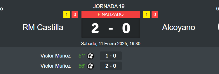 El Real Madrid Castilla firma su tercera victoria consecutiva en casa, suma 10 puntos en 5 partidos y sale de descenso gracias a un doblete de Víctor Muñoz ante el Alcoyano (2-0).