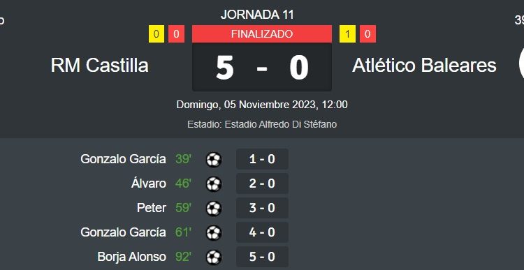 El Real Madrid Castilla suma cuatro partidos sin perder y vuelve a ganar tras dos empates, cosechando un 5-0 en casa ante el Atlético Baleares. Goles madridistas obra de Gonzalo García (x2), Álvaro Rodríguez, Peter González y Borja Alonso. Jornada 11 de la Primera Federación 2023/24.