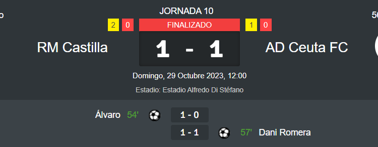 El Real Madrid Castilla suma tres partidos sin perder con dos empates consecutivos, cosechando un empate a 1 en casa ante el Ceuta. El gol madridista fue de Álvaro Rodríguez. Jornada 10 de la Primera Federación 2023/24.