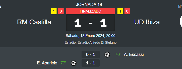 - 1 por parte del Castilla. Amarilla a David González, tercera tarjeta de la temporada.