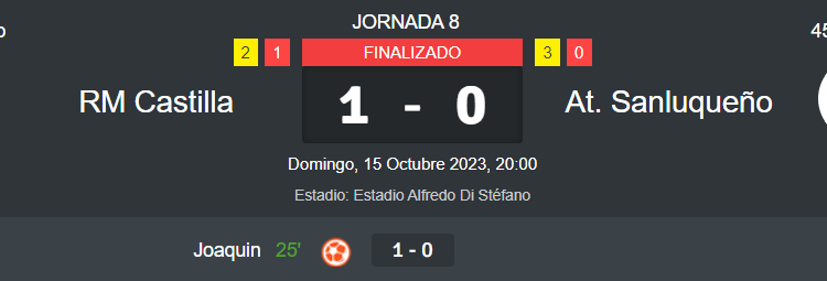 El Real Madrid Castilla logra su primera victoria en casa de la temporada, con un 1-0 ante el Atlético Sanluqueño, gol madridista de Nico Paz. Jornada 8 de la Primera Federación 2023/24.