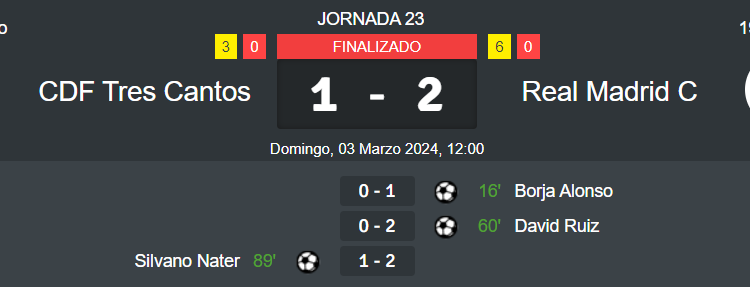 El Real Madrid C vuelve a ganar fuera de casa y mantiene su ventaja en lo más alto de la tabla (1-2, goles madridistas de Borja Alonso y David Ruiz). Jornada 23 de la Tercera Federación 2023/24, Grupo 7.